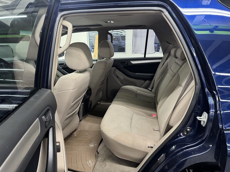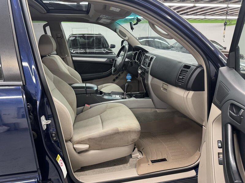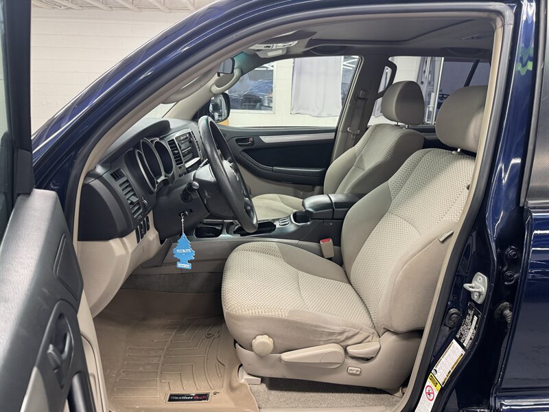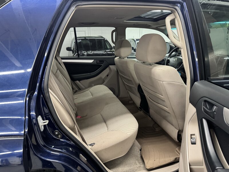 2007 Toyota 4Runner SR5 4-door SUV in Nautical Blue Metallic with Stone cloth interior, low miles at 123,000 (averaging under 7,000 miles/year). Powered by the factory 4.0L V6 producing 236 hp and 266 lb-ft of torque, this well-maintained SUV returns an EPA-estimated 16 MPG city / 20 MPG highway and is in excellent overall condition with a clean CARFAX. Factory-standard SR5 equipment includes power windows, door locks and mirrors, remote keyless entry, cruise control, air conditioning, tilt steering, cloth seating with power-adjustable driver’s seat, AM/FM/CD stereo with factory speakers, and an available roof rack; safety features include front airbags, side-impact and curtain airbags, anti-lock brakes and stability/traction control systems. This 4Runner offers dependable V6 performance and a complete factory feature set in a clean, well-preserved package.
