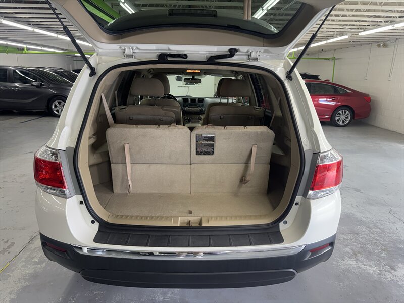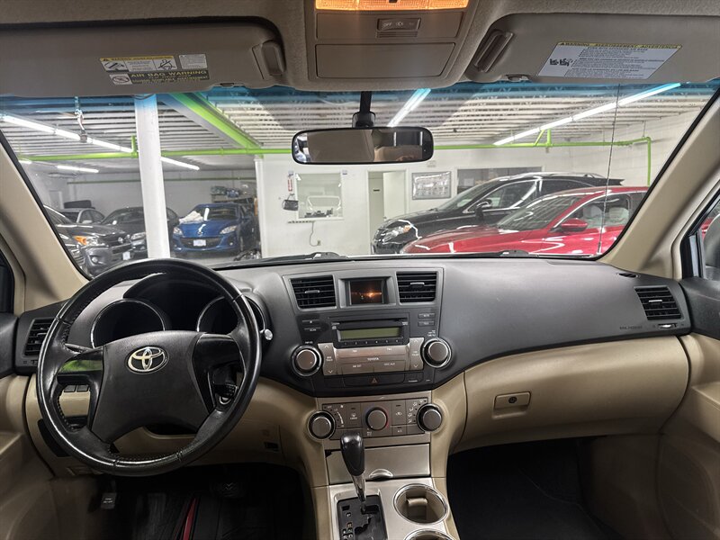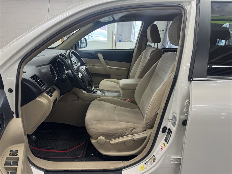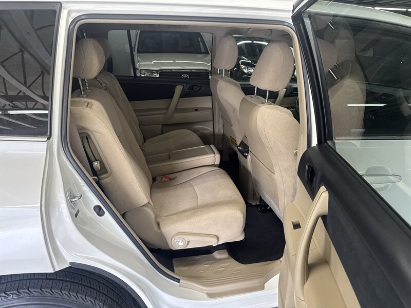 One-owner 2012 Toyota Highlander in Blizzard Pearl with Sand Beige interior, below 110,000 miles (averaging under 8,000 miles/year), a clean CARFAX and 22 documented service records — excellent overall condition. Powered by the factory 3.5L V6 producing 270 hp and 248 lb-ft of torque, with EPA ratings of 17 MPG city and 22 MPG highway. Factory equipment includes a full suite of safety and chassis systems (ABS, electronic brake-force distribution, traction control, vehicle stability control, front and side-curtain airbags, and tire pressure monitoring), power windows/locks/mirrors, remote keyless entry, cruise control, tilt/telescoping steering wheel with steering-wheel audio controls, and an AM/FM/CD audio system with auxiliary input. Comfort and utility features include Sand Beige cloth seating, rear air vents, 60/40 split-folding second-row seats for flexible cargo space, roof rails, and alloy wheels — a well-maintained, well-equipped Highlander ready for reliable daily use.