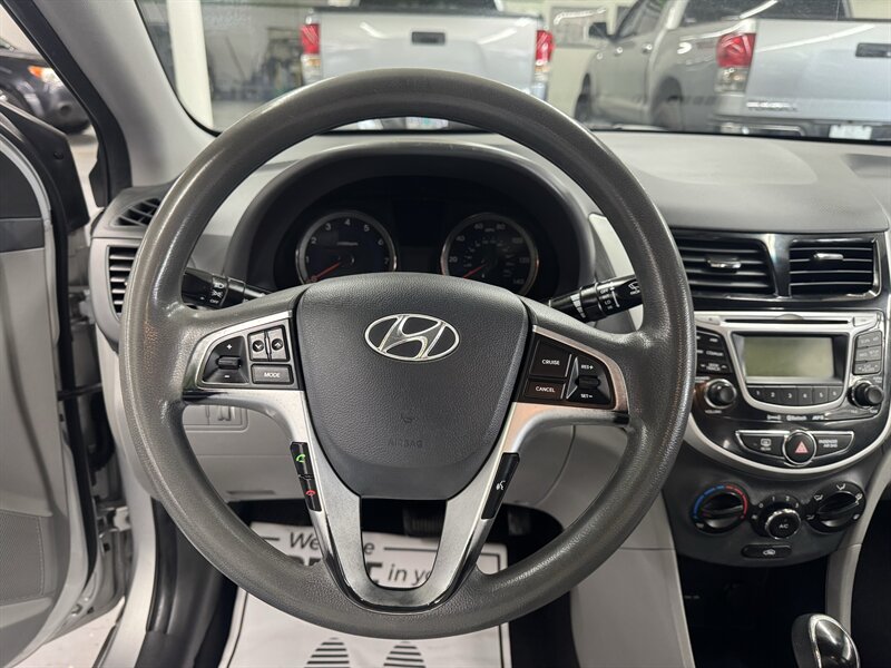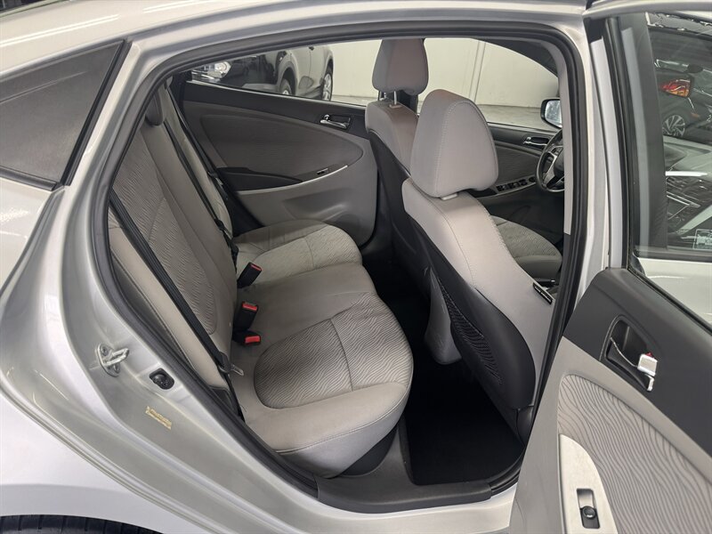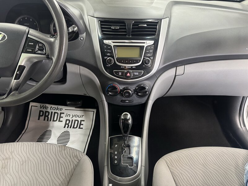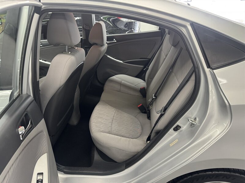 2013 Hyundai Accent GLS — One owner, low miles (53,000), Ironman Silver exterior with Gray cloth interior. Powered by a 1.6L I4 producing 138 hp and 123 lb-ft of torque; excellent overall condition and averages under 4,000 miles per year. EPA-rated at 28 MPG city and 37 MPG highway. Factory equipment includes power windows and door locks, remote keyless entry, air conditioning, cruise control and tilt steering, steering-wheel audio controls, AM/FM/CD/MP3 audio with auxiliary and USB inputs, 60/40 split-folding rear seat, 15-inch wheels, rear window defogger, intermittent wipers, and a full complement of safety features (ABS, electronic stability control, traction control, front and side airbags, side curtain airbags, and tire-pressure monitoring).