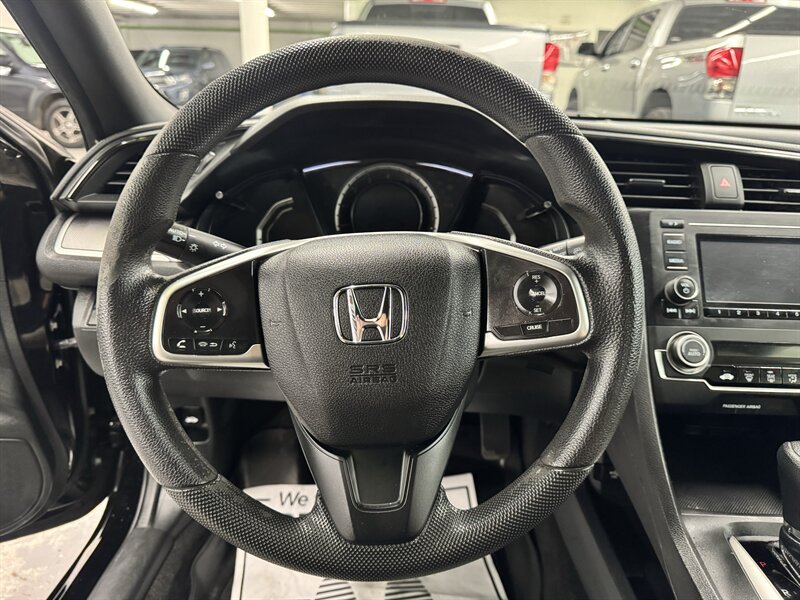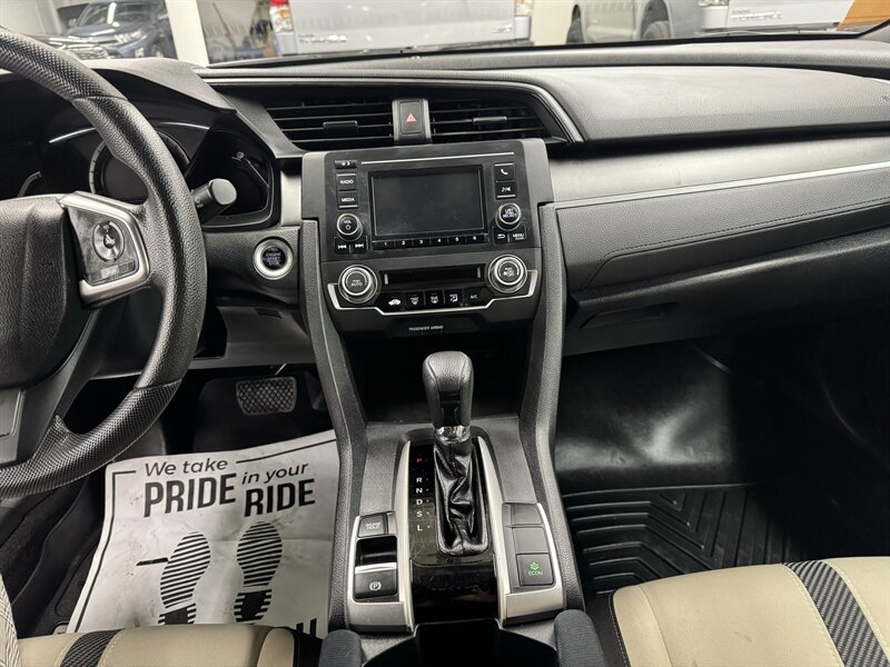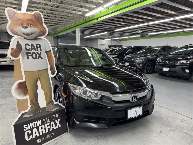 2016 Honda Civic LX-P — 2.0L I4 (158 hp / 138 lb-ft), two owners, 18 service records, excellent overall condition. Black exterior with Black/Ivory interior; EPA-rated 30 MPG city / 41 MPG highway. Factory-standard equipment includes air conditioning, power windows and door locks, remote keyless entry, cruise control, Bluetooth HandsFreeLink and audio streaming, rearview camera, tilt/telescoping steering wheel with steering-wheel-mounted audio controls, AM/FM/CD/USB/AUX audio system, 5-inch info display, cloth seating with 60/40 split-folding rear seat and 16-inch alloy wheels. A reliable, well-maintained compact with strong fuel economy and practical standard features.